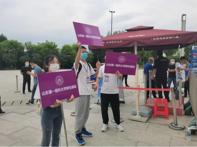 在各个车站公司也提供暖心服务,迎新志愿者们在各个站点举着校牌,等待着师弟师妹们的到来,并耐心地为他们指引。