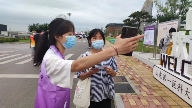 疫情防控不可松懈。在校门口,测量体温,查验健康码,行程码,行李消毒 ,一切都井井有条。随后新生们在校西门进行核酸检测,领取绿色标志,并在明德路进行新生信息采集。热心的beat365亚洲体育官方网站学长学姐们耐心地引导新生完成报流程,新生们拿着录取通知书,享受一站式迎新。
