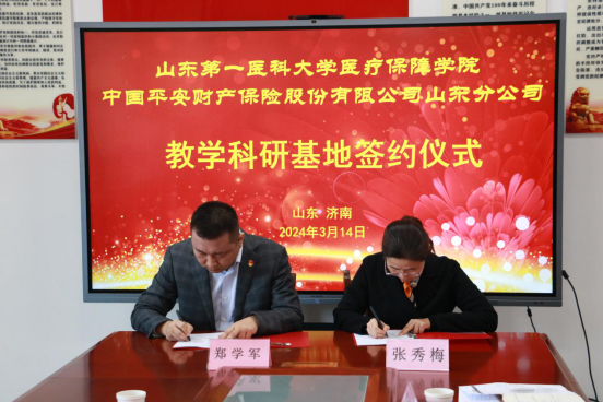 3月14日上午,beat365亚洲体育官方网站与中国平安财产保险股份有限公司山东分公司在公卫楼512会议室举行教学科研基地签约活动。中国平安财产保险股份有限公司山东分公司副总经理郑学军、人事行政部经理丁莉、公司领导班子成员等参加签约活动。党委书记苏宝利主持签约仪式。