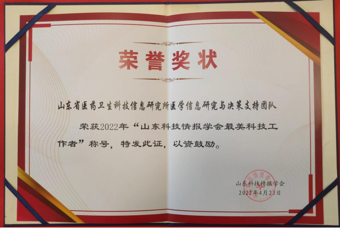 近日,山东科技情报学会公布了2022年学会“最美科技工作者”评选结果,我单位“医学信息研究与决策支持团队”获此殊荣。是获得该项荣誉的五个团队之一。