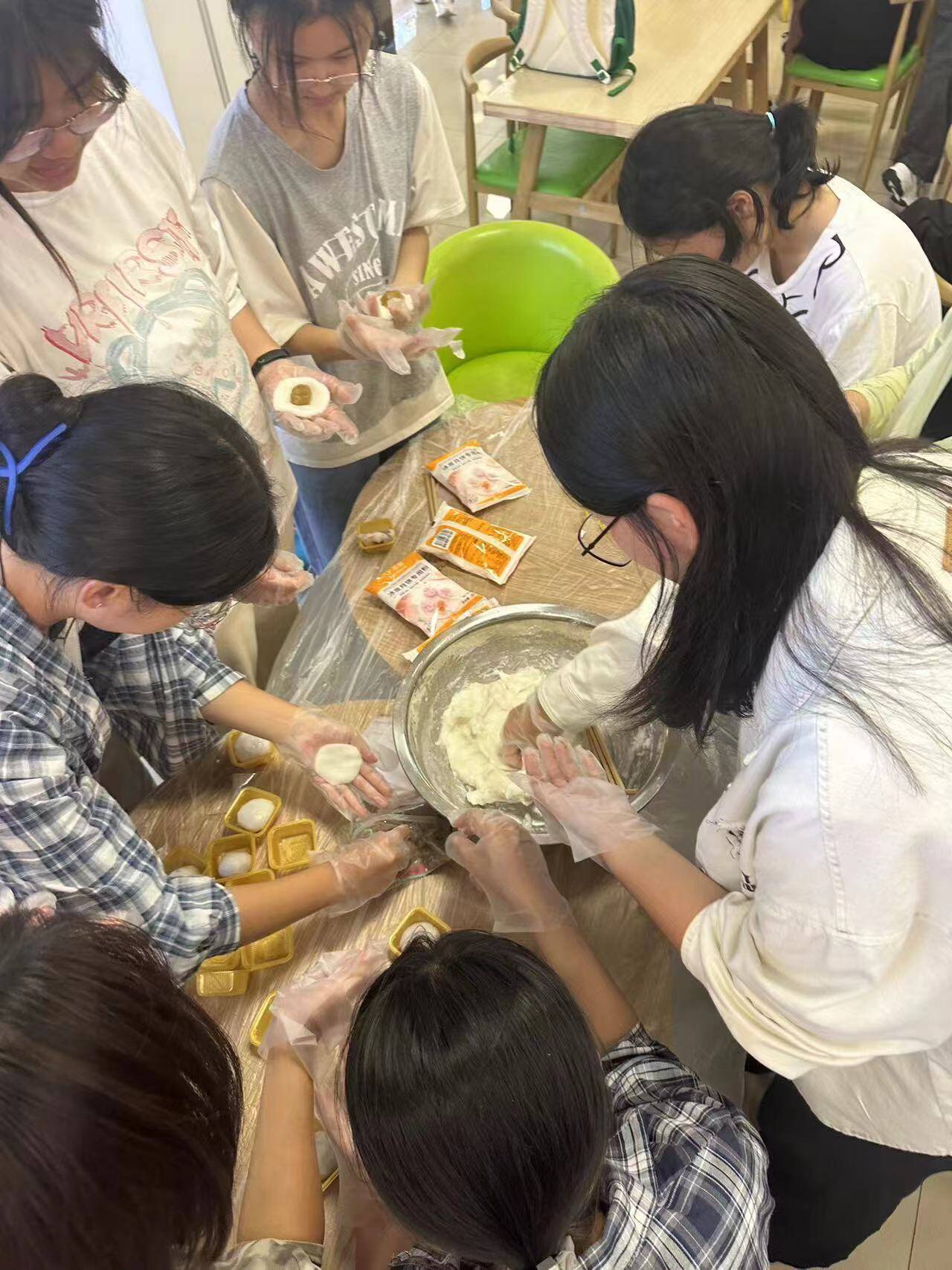活动现场热闹非凡,同学们围坐在桌前,按照步骤精心制作每一块月饼。大家一边制作月饼,一边相互交流心得、分享制作技巧,欢声笑语不断。经过大家精心协作,一块块色香味俱全的月饼顺利制成,让人垂涎欲滴。
