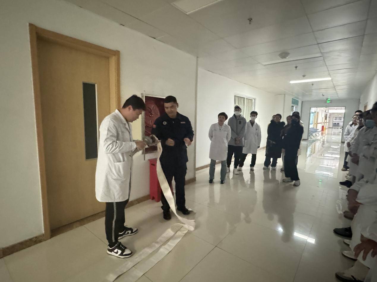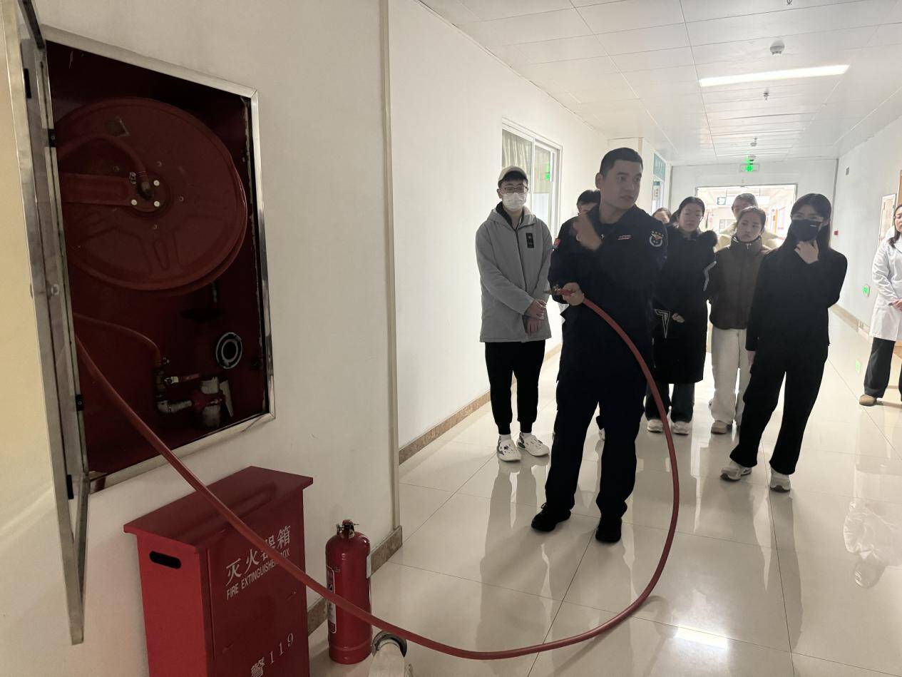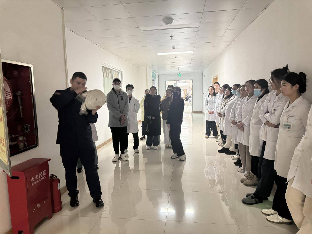活动邀请医院消防工作人员对防排烟系统、火灾自动报警系统、自动喷水灭火系统等常见消防设施进行讲解并现场演示了灭火器、室内消火栓等常用救火设备的使用方法。随后,在科室的安排和负责人的带领下,同学们模拟了遇见火情后从报警、疏散到灭火、救护的一系列环节,整个流程配合密切、安全有序,引起积极反响。
