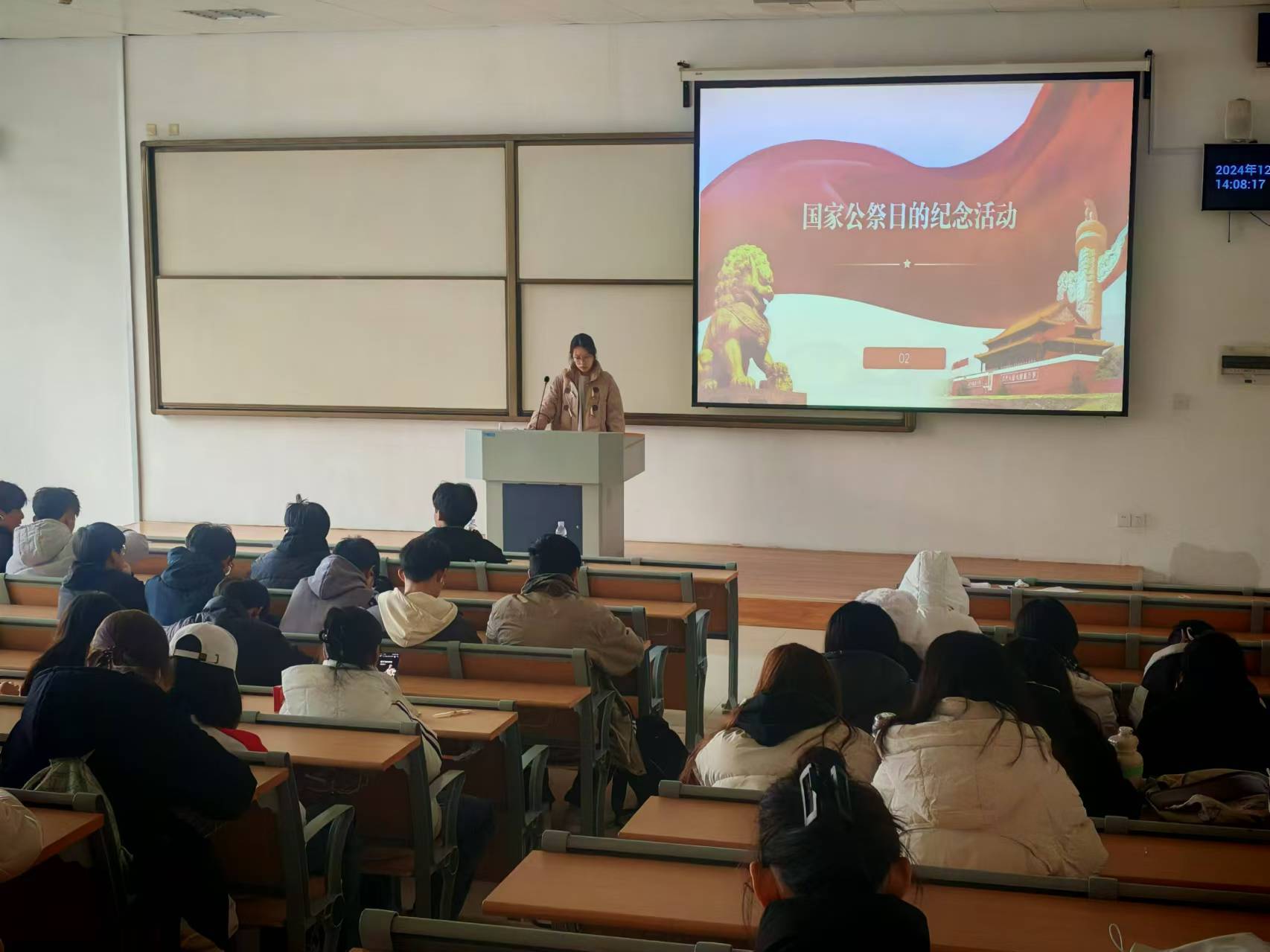 预防医学(医疗保障方向)全体员工为南京大屠杀遇难者默哀,沉痛追思。默哀结束后,同学们通过精心制作的PPT 以及纪录片,一起回顾了南京大屠杀那段黑暗的历史,随后员工代表发表演讲,呼吁同学们铭记历史、珍惜当下、展望未来。全体员工齐唱《歌唱祖国》,进一步激发了同学们的爱国热情和民族自豪感。