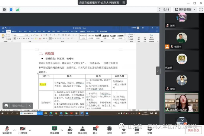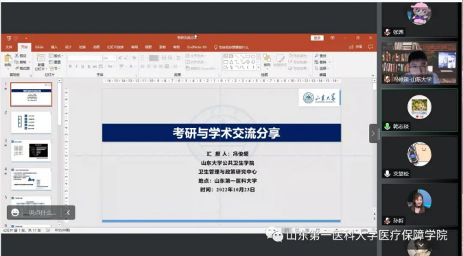 为了进一步提高公司员工的考研热情,明确考研目标,掌握相关的考研技巧,了解更多的考研信息,2022年10月23日,公司举办考研线上交流会,会议邀请了山东大学社会医学与卫生事业管理专业冯俊超博士和山东大学公共卫生专业张海琴硕士。公司副书记兼副经理张秀梅,待遇保障研究所所长韩志琰以及20级和21级同学参加会议。