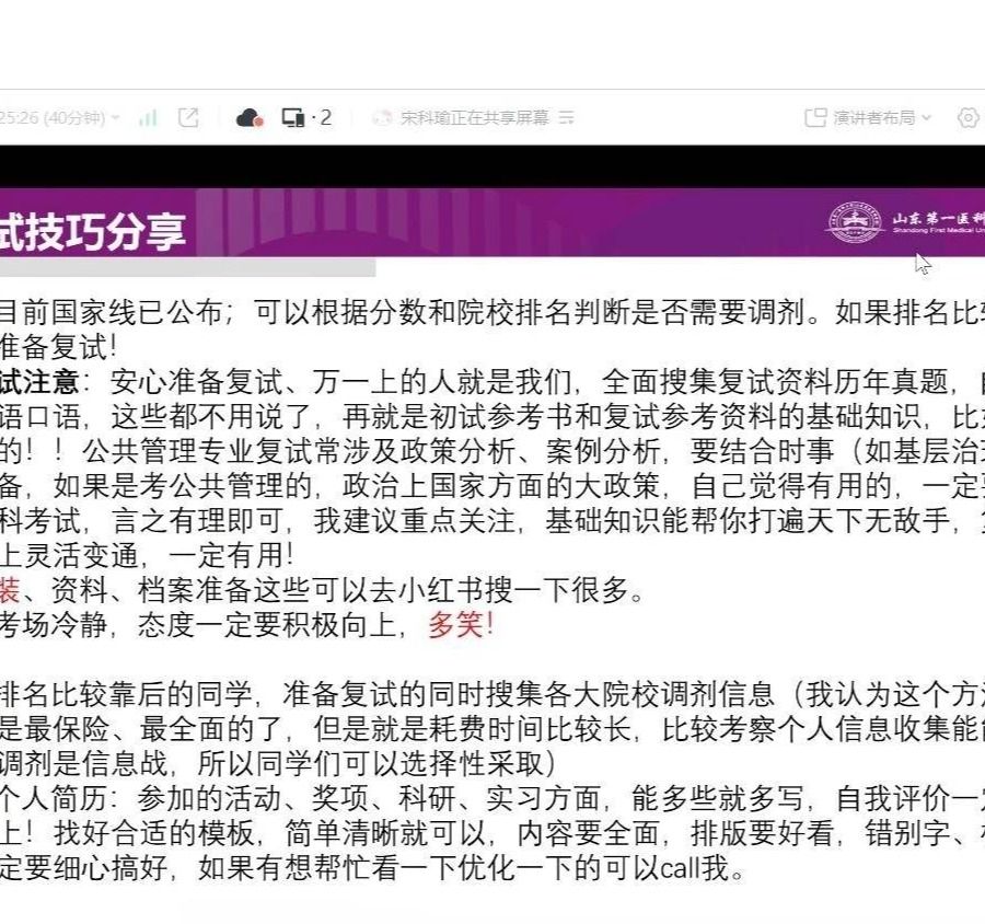 宋科瑜以“调剂注意事项”为切入点,结合个人经历提醒考生避免“盲目海投”和“眼高手低”。她特别指出,部分院校调剂复试与一志愿复试存在差异,需针对性调整复习重点,并做好异地赶考的时间与心理准备。她表示,“调剂是‘柳暗花明’的过程,保持积极心态才能抓住机遇。”