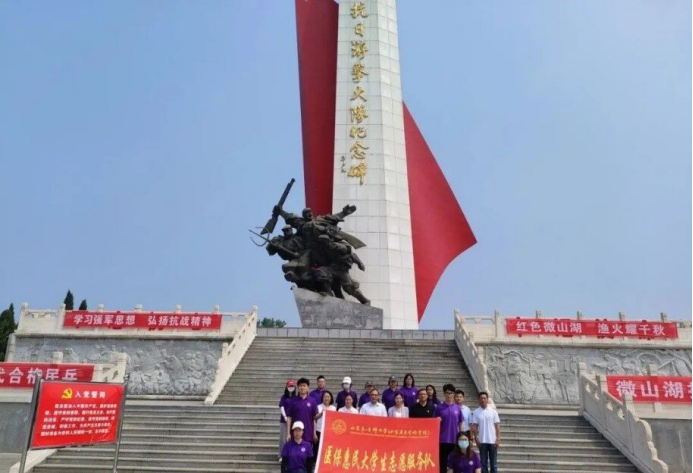 队员们在微山湖抗日游击大队纪念碑前重温入党誓词,表示要用扎实的专业知识和昂扬的青春力量为民族复兴努力奋斗。